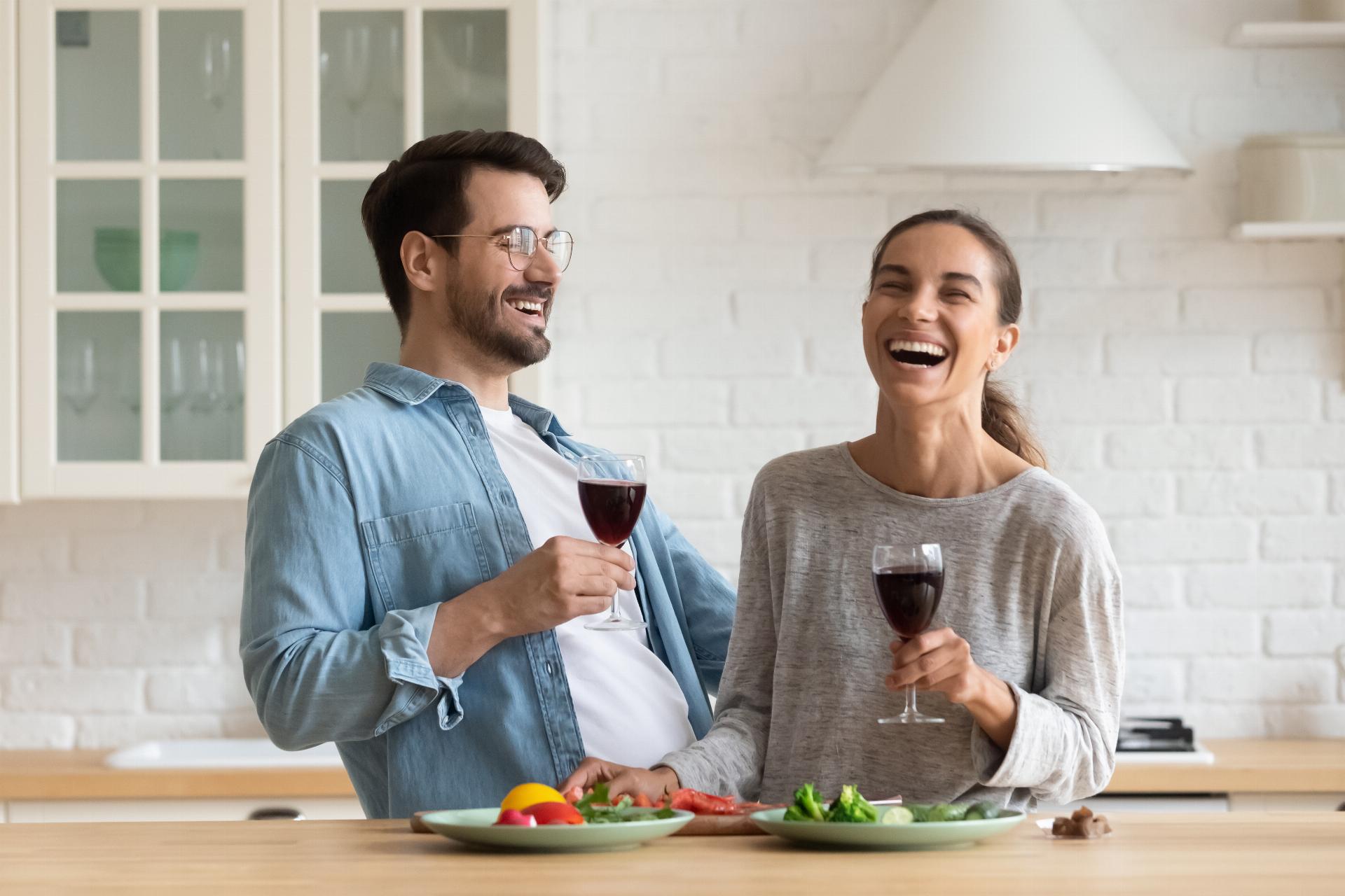 Happy young romantic couple cooking laughing drinking wine in kitchen Share FacebookTwitterLinkedInPinterestStumbleuponEmail